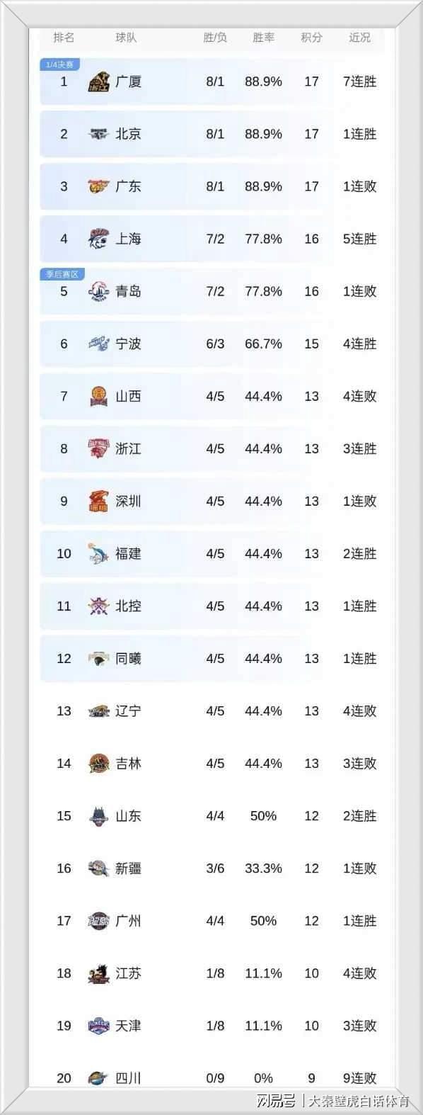 ①、廣廈、北京、廣東三強鼎立,8勝1負位居前三甲;