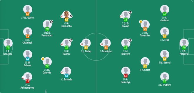 切爾西首發:1-桑切斯、34-喬什·阿昌龐(46'24-詹姆斯)、23-查洛巴、27-古斯托、29-福法納、25-凱塞多、8-恩佐、41-埃斯特旺(92'11-吉滕斯)、10-帕爾默(63'20-若昂·佩德羅)、49-加納喬(46'7-內托)、9-德拉普(87'17-桑托斯)