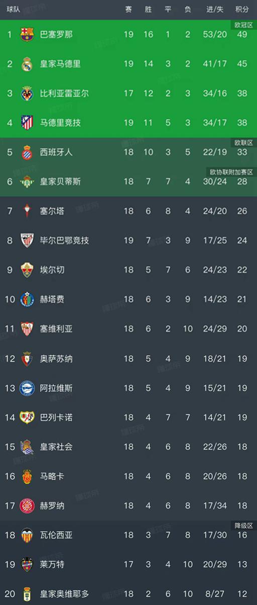 北京時間1月5日,隨著皇馬5-1皇家貝斯,馬競1-1皇家社會,馬略卡1-2赫羅納、阿拉維斯1-1皇家奧維耶多、萊萬特3-0塞維利亞的比賽結束,西甲第18輪結束了所有比賽,最新排名如下!